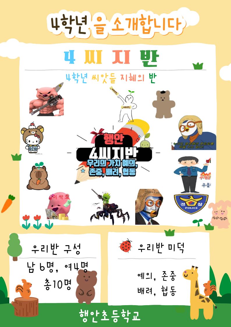 🖼️ Step 4. 패들렛 전시 및 학급 소개 자료 완성 완성된 로고와 캐릭터를 패들렛에 실시간으로 업로드했습니다. 친구들의 작품에 '좋아요'를 누르고 "이 캐릭터 우리 반 이미지랑 딱이야!"라며 서로 응원하는 소통의 장이 열렸죠. 이 디자인들을 모아 제가 직접 **'4학년 O반 학급 소개 자료'**의 메인 표지를 꾸며주니 아이들의 자부심이 대단했습니다. 우리반 메인 로고는 마지막 제일 좋아요를 많이 받은 2개의 작품 중에서 재투표를 실시하여 선정했습니다.